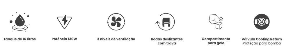 Potência: 130W Frequência: 60 Hz Funções: Multifuncional em 1 (Climatiza, Umidifica e Ventila) Tipo de climatização: Frio Capacidade do tanque de água: 16 L Consumo de água: 1 à 3 L/h Abastecimento de água: Manual