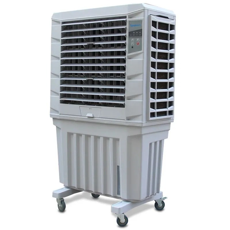 Climatizador evaporativo portátil com reservatório de 125L e vazão de 9000 m³/h. Ideal para resfriar ambientes amplos com economia e eficiência. Conta com controle remoto, ajuste de velocidade e funcionamento em 220V. Prático, potente e fácil de mover.